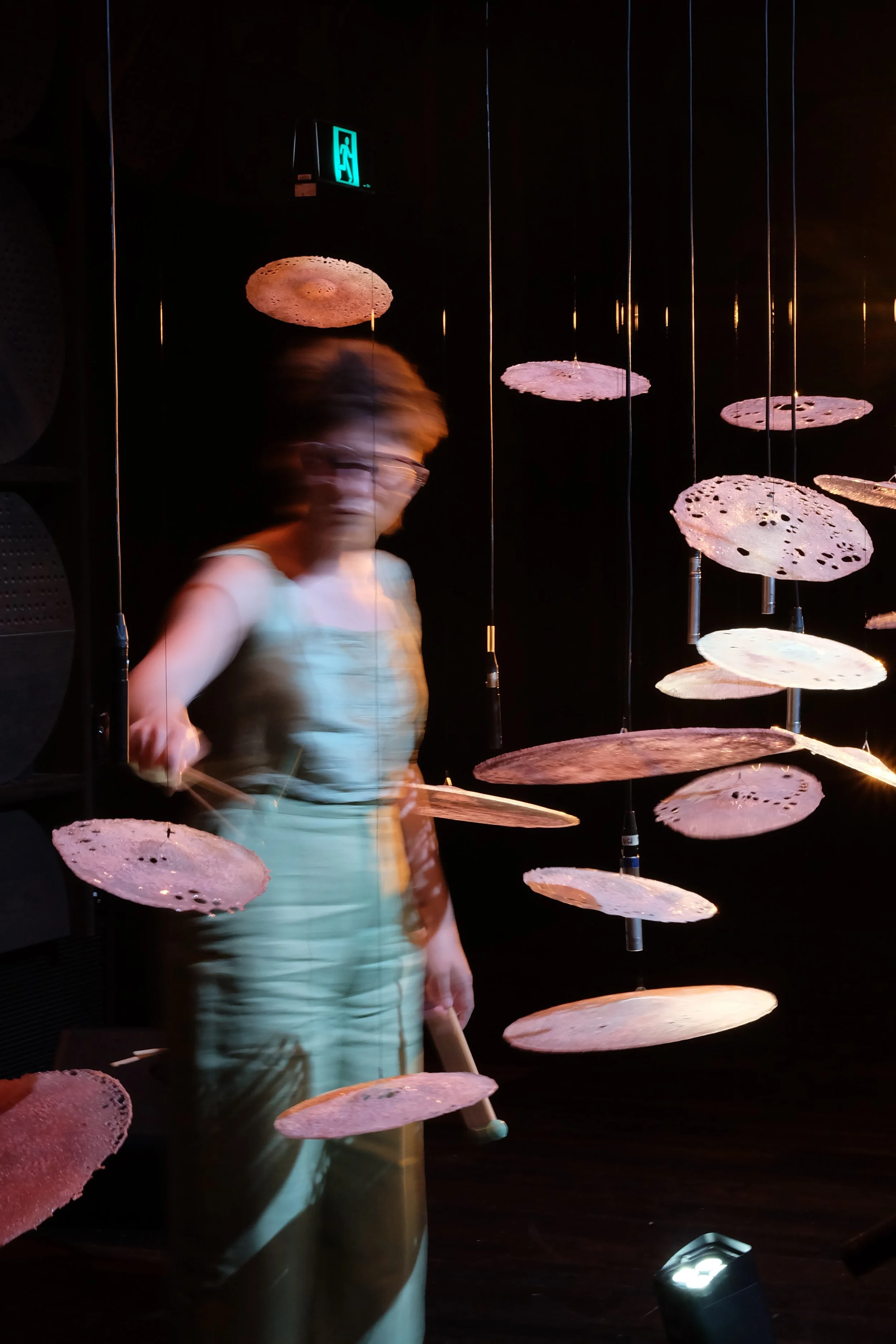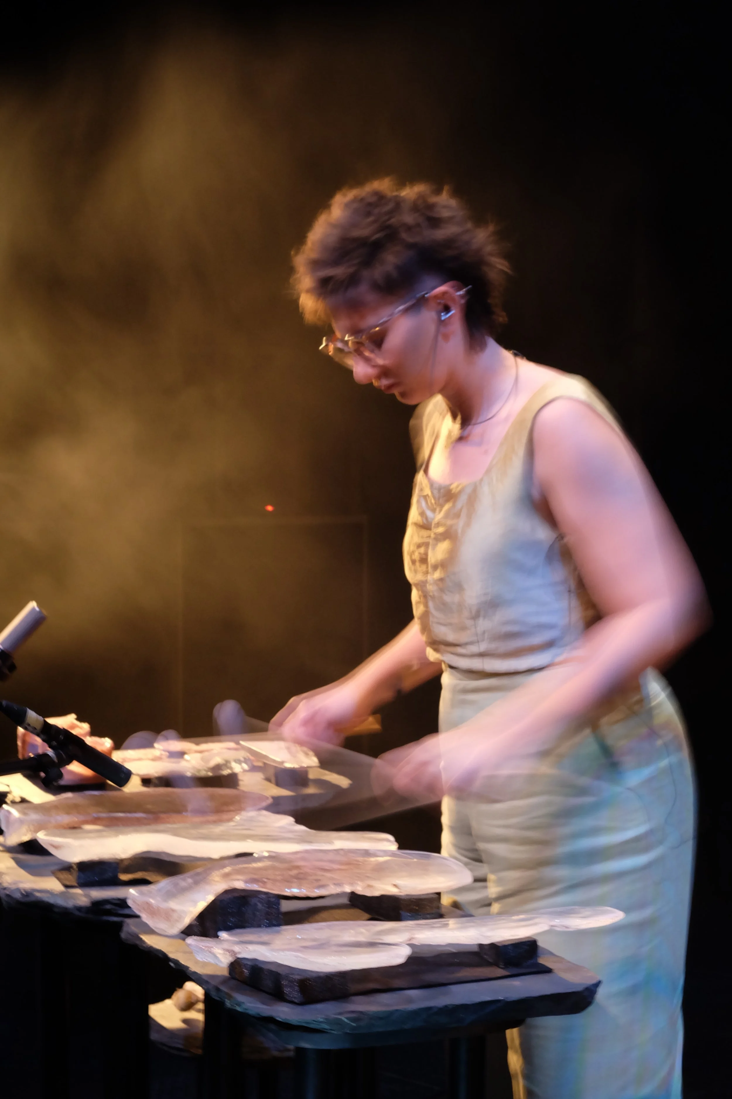 Shock Lines is a visceral exploration of the resonance and materiality of glass. Moving between performance and installation, the work features suspended glass-sandstone sculptures and immersive surround sound. Audiences are invited to explore the gritty, crumbling textures of glass in the installation, followed by a 45-minute performance of percussion and live electronics. Rumbling, crunching and scraping, Shock Lines reimagines the strength and fragility of glass through sound.